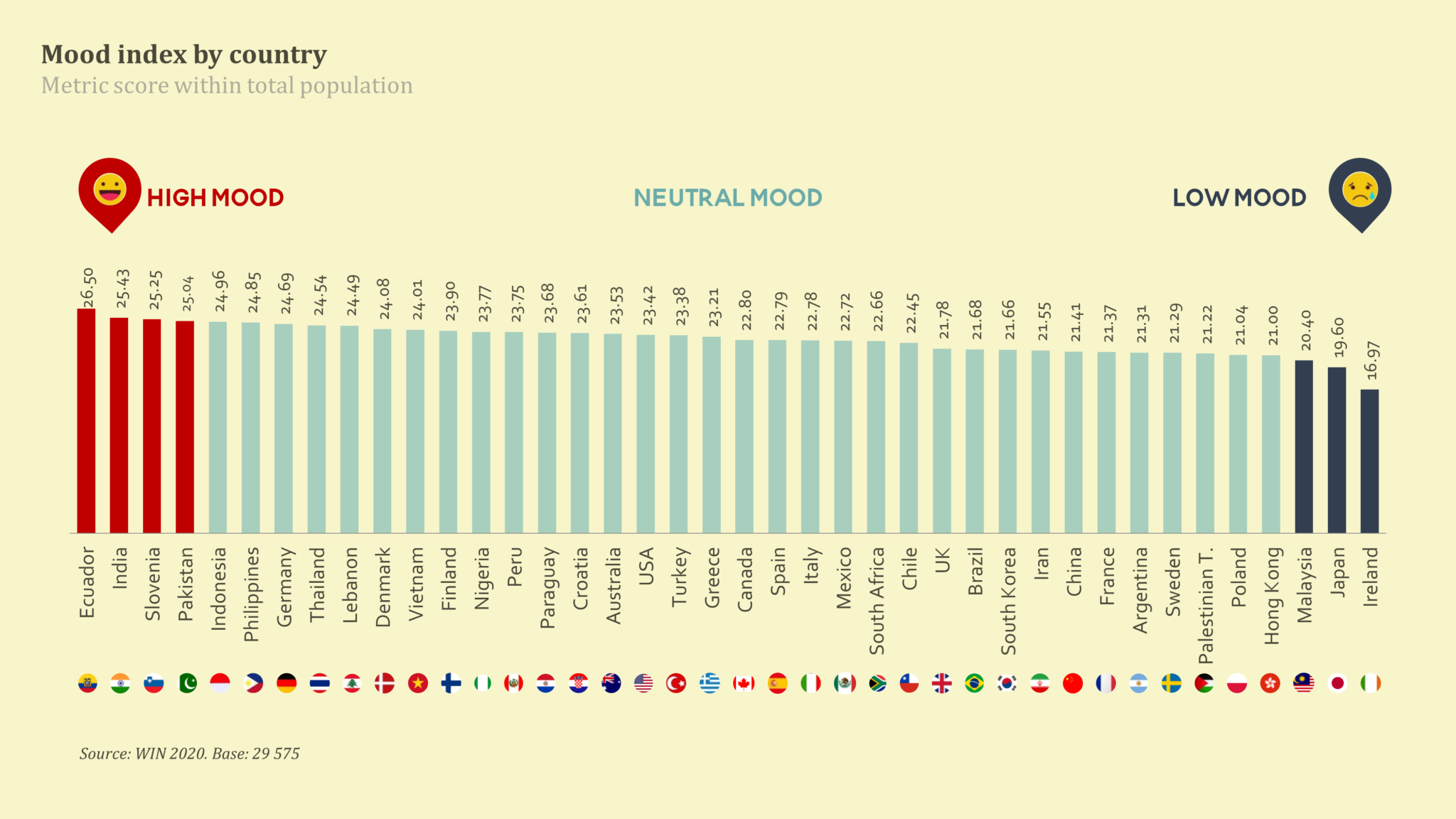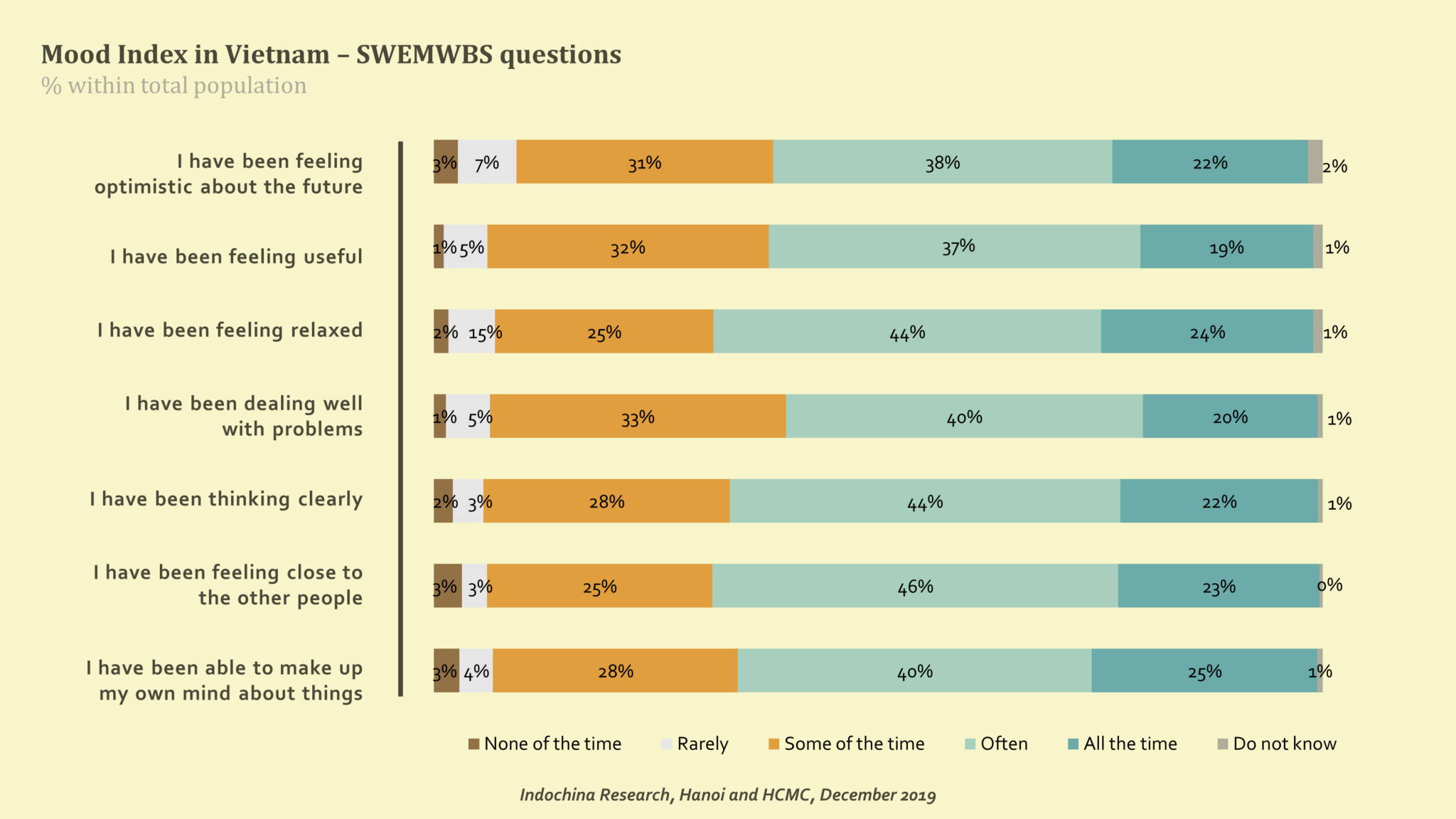 Vietnam also scores high regarding mood index at 24.01 pts and ranked 11th among 40 countries. The majority of the Vietnamese people agree that they have been feeling