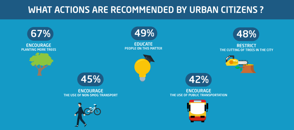 As for their recommendation, 67% of respondents insists on planting more trees as well as ceasing the cutting of trees in the cities (48%).