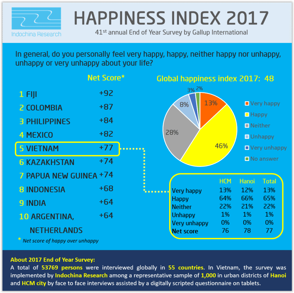Among 55 countries polled, Vietnam population is the 5th happiest, 2nd only in ASEAN to the Philippines and ahead of Indonesia !