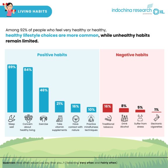 Thói quen sống: Họ duy trì chất lượng giấc ngủ tốt (89%), quan tâm đến các lối sống lành mạnh (84%) và chăm tập thể dục (46%).