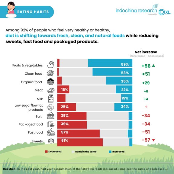 Thói quen ăn uống: Họ duy trì thói quen ăn uống lành mạnh: ăn nhiều rau củ quả (↑59%), thực phẩm sạch (↑53%), hữu cơ (↑35%) và giảm tiêu thụ đồ ngọt (↓61%), đồ ăn nhanh (↓57%) và đồ đóng hộp (↓39%).